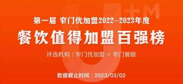 此次大會,窄門優加盟聯合窄門餐眼,發佈第一屆餐飲加盟百強榜(2022~2023年度)。本次以數據為核心,多維度評價,篩選出瞭一批高質量品牌,為餐飲人、投資人、 創業者等群體提供瞭一定參考價值。
