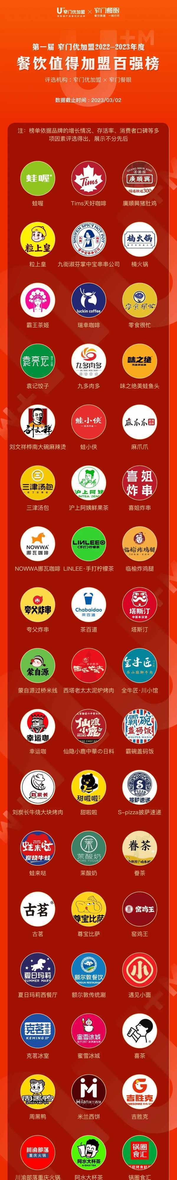 窄門優加盟聯合窄門餐眼,以數據為核心,基於品牌創立時間、門店規模、發展階段、年增速、年存活率幾大維度,輔以行業專傢評委的打分,評選出瞭百強品牌。