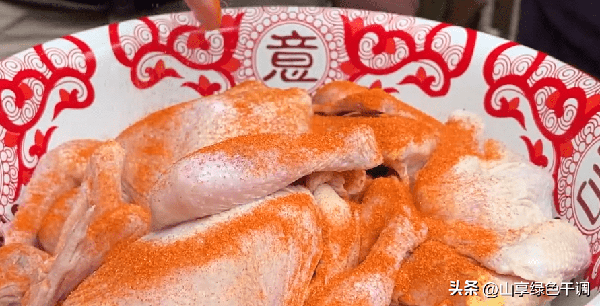 6.按照1斤雞放20到25克左右的醃料,3克胡椒粉,8克鹽大的比例給雞調味,用手不停的抓勻。醃制三個小時。