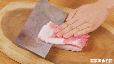 3. 五花肉去皮,片成薄片後切絲·建議挑選肥一點的五花肉,因為漬菜粉跟酸菜白肉一樣,裡頭的酸菜需要猪油的滋潤來提升風味。