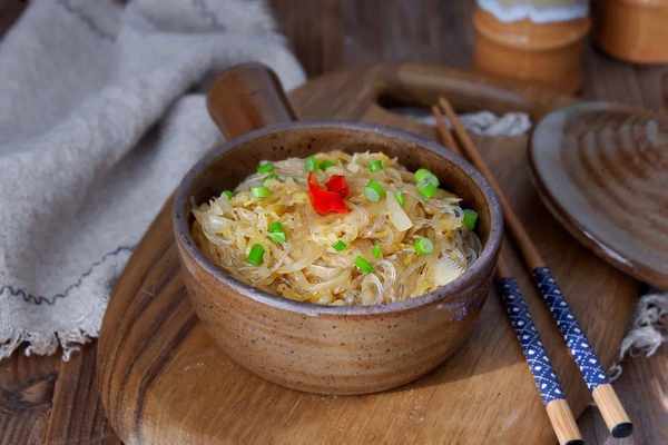 6.加入粉條用筷子翻炒均勻,蓋上鍋蓋煮1-2分鐘至湯汁收幹,出鍋前撒上蔥花。