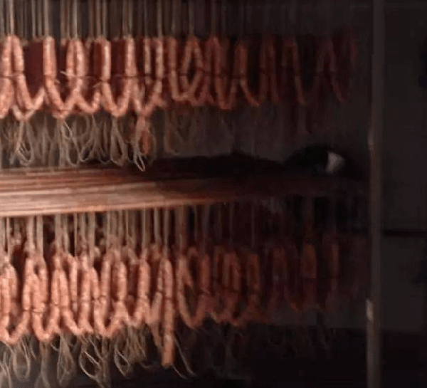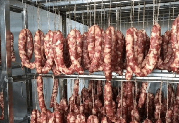 歷時5到6個小時,在捆綁好的臘腸裝入熱泵烘幹房後兩小時內,溫度快速升到60到65度,不用排濕。這一過程主要是起到一個發酵的過程,控制肉不變色變味。這就是我們說的預熱階段。預熱時間後,調節溫度到45到50度,濕度控制在50%到55%的范圍之內。註意事項:臘腸烘幹時溫度不能過高,高於65度時臘腸會出現滴油現象。而且臘腸烘幹時如果長時間溫度高於68度,臘腸會漚爛。