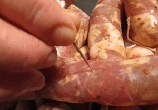 先將腸衣全部灌滿,在結尾處先打活結,適當拍打香腸,讓肉更緊實,以便放氣後再填充; 然後用手分段,用鐵釘一排排給香腸放氣,逐段排氣,逐段用棉線打結分段。綁臘腸的繩子通常使用天然曬幹的玉米皮,而不要使用任何化纖成分制成的繩子。