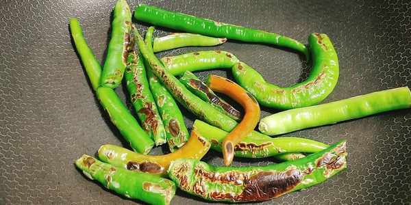 4.將二荊條放入鍋中,小火煎至兩面虎皮,最後放入2滴香油,爆一下,這樣虎皮更加厚重。【備註:如果是在農村,最好是用柴火將二荊條燒成虎皮,這樣做出來的虎皮青椒更香喲~】