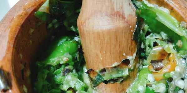 5.將煎好虎皮的二荊條放入擂缽裡面,加入一勺食用鹽,擂成如圖所示的樣子。