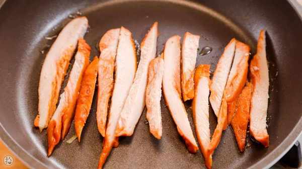1.平底鍋熱油後放入雞胸肉條,煎至熟透後盛出。
