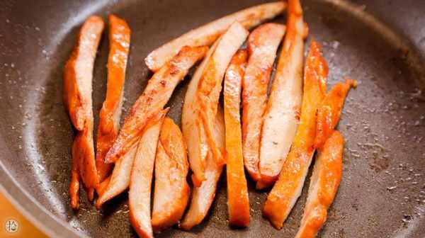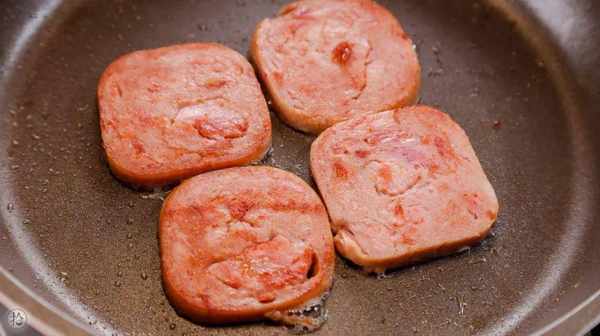 1.午餐肉用平底鍋無油煎至兩面微黃。