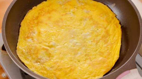2.雞蛋打散成蛋液,煎成蛋餅,對折後盛出待用。