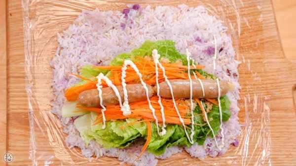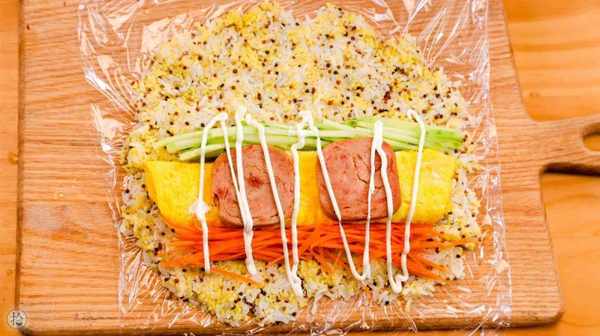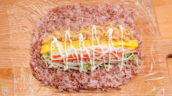 4.依次加入飯團中的食材,蛋餅、胡蘿卜絲、青瓜絲、午餐肉,最後擠上沙拉醬。