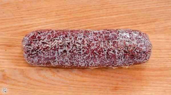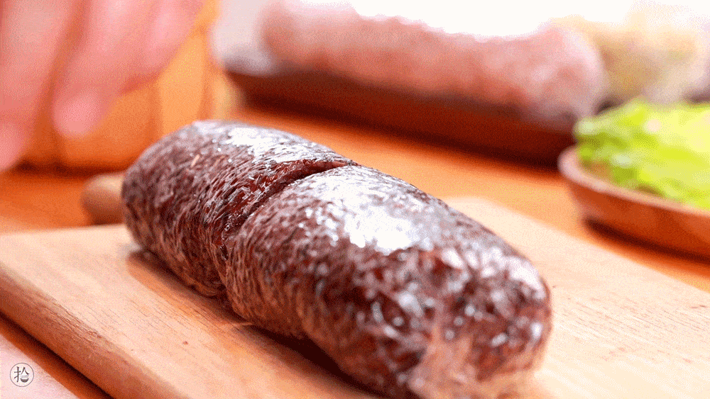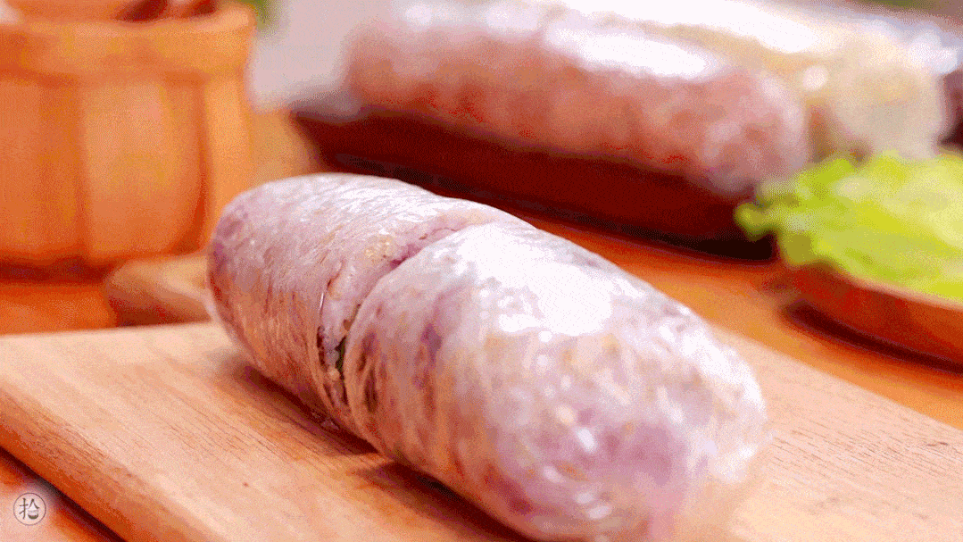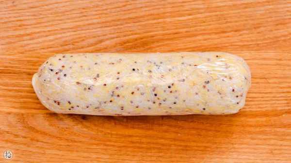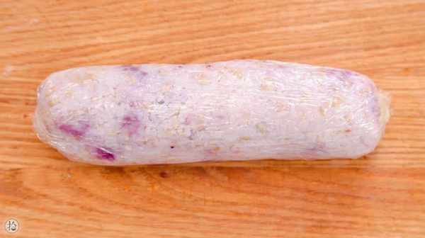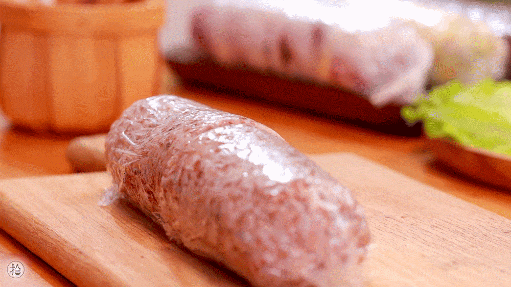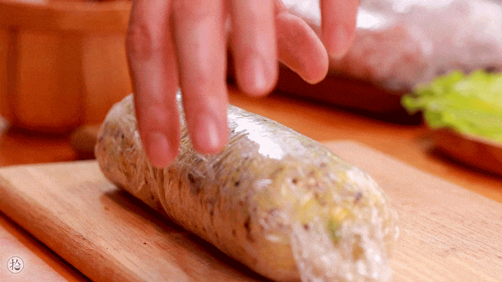 5.提起保鮮膜,一邊卷一邊用力按壓緊實,兩頭捏緊定型。