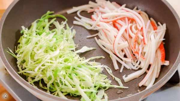 1.熱鍋少油,放入包菜絲和蟹柳絲,小火煎至熟頭盛出。