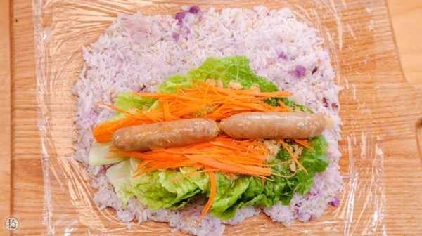 3.依次加入飯團中的食材,生菜葉、胡蘿卜絲、肉腸和肉松。