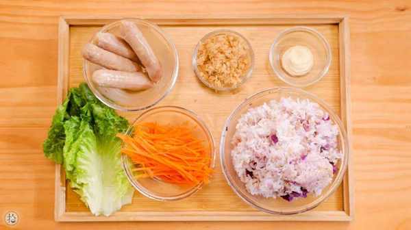 燕麥紫薯米/250g、胡蘿卜絲/30g、生菜/30g、肉腸/4根、肉松/20g、沙拉醬/適量
