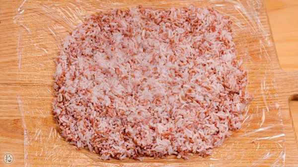 2.案板上鋪上保鮮膜,放入紅米飯,按壓平整。(Tips:紅米飯的做法:大米50g,紅米150g,清水450g,把這些食材放進電放鍋裡,按煮飯鍵就可以瞭)