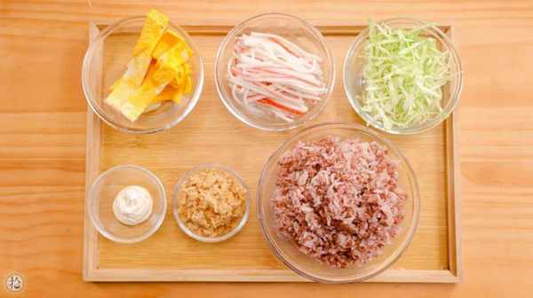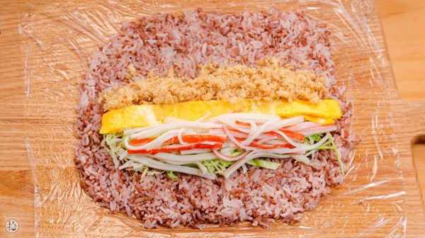 3.依次加入飯團中的食材,包菜絲、雞蛋絲、蟹柳和肉松。