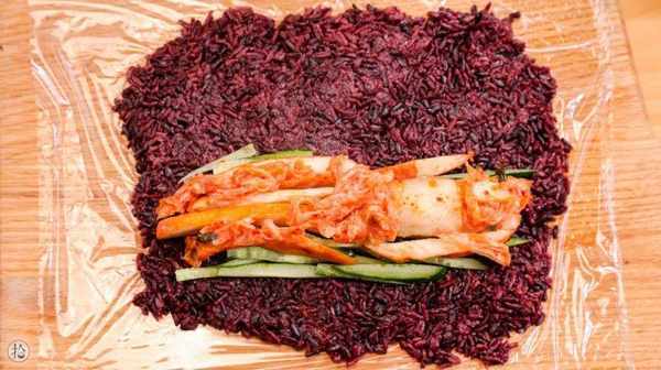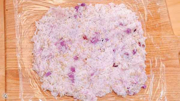 2.案板上鋪上保鮮膜,放入煮好的紫米飯,按壓平整。(Tips:紫米飯的做法:大米50g,紫米150g,清水450g,把這些食材放進電放鍋裡,按煮飯鍵就可以瞭)