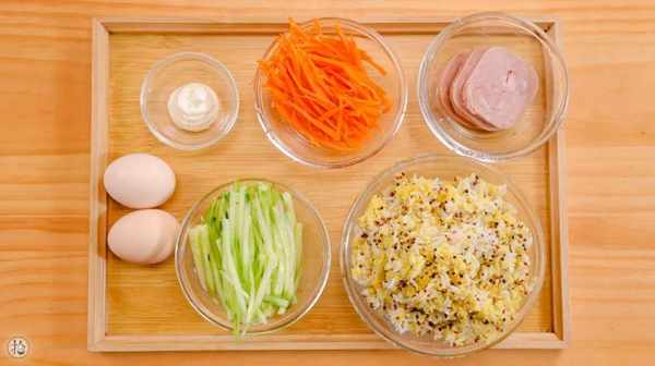 雞蛋/2個、青瓜絲/40g、胡蘿卜絲/40g、午餐肉/100g、小米藜麥飯/250g、低脂沙拉醬/適量