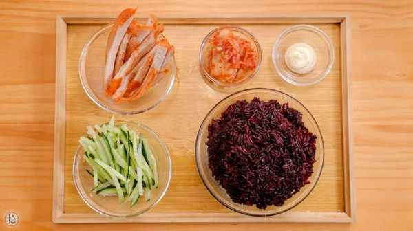 紫米飯/250g、青瓜絲/50g、雞胸肉/200g(提前用奧爾良粉醃制)、泡菜/10g、沙拉醬/適量