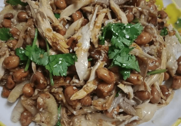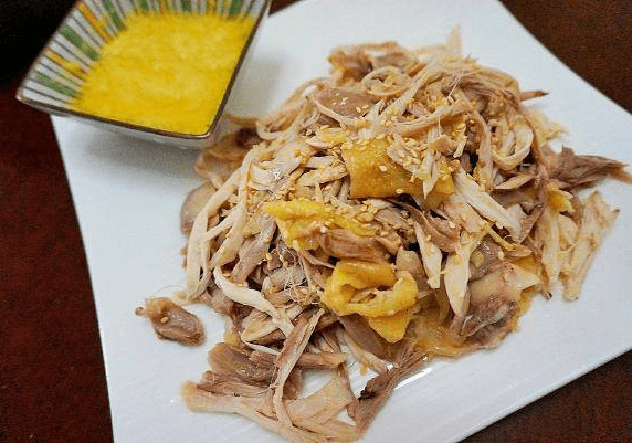 8.煮好後取出,待溫熱時帶上手套把肉撕下來,最後鍋中的餘汁倒在肉上,根據個人喜好擠上點檸檬汁,撒上熟芝麻,花生,香菜即可