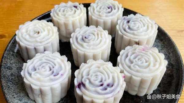 2、準備個月餅模子,把山藥按出一個坑,放入紫薯餡,虎口收攏法包好,再壓出花紋,山藥紫薯糕就好瞭。