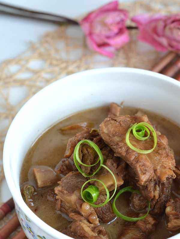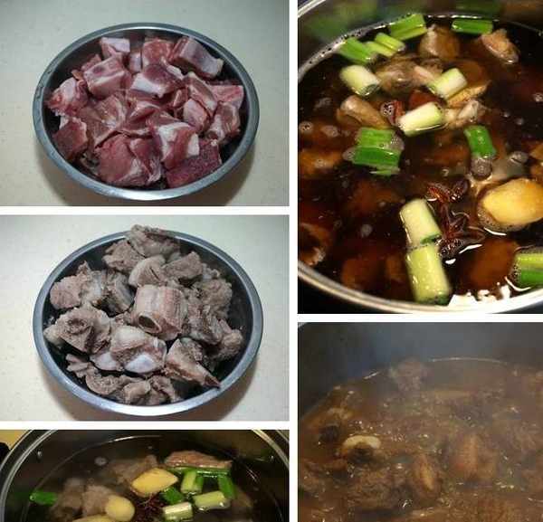 材料:排骨1000克,大蔥半根,八角三顆,薑三片,醬油少許,生抽少許,鹽適量