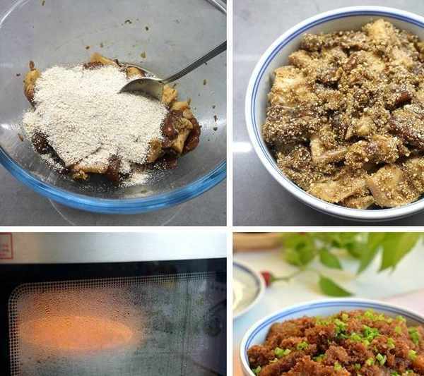 10.將一半的米粉倒入醃好的肉片盆中,混合均勻,使每一片肉都沾滿米粉,如果使每顆米粉都被湯汁打濕;