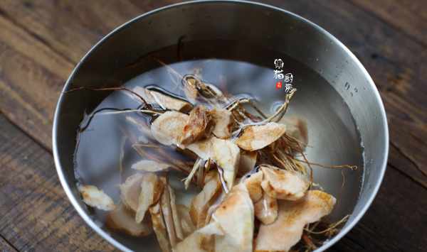2.把五指毛桃和土茯苓用清水淘洗幹凈,五指毛桃是一種植物的根部,有淡淡的椰子香味,清洗掉表面的浮灰就可以瞭。