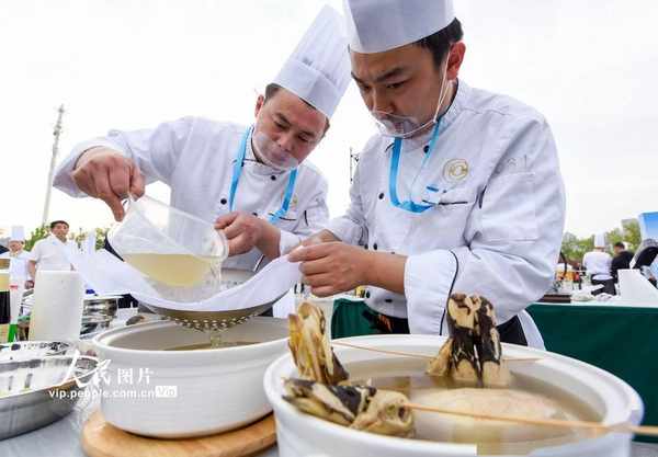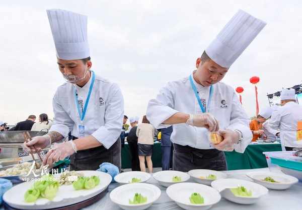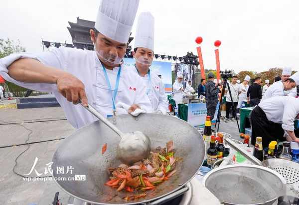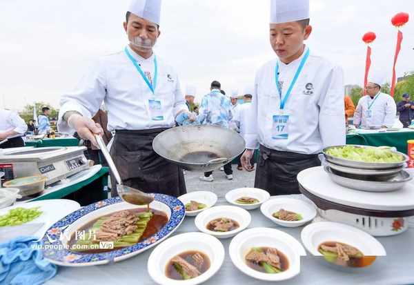 4月28日,淮安·揚州2023首屆淮揚菜美食名店名匠挑戰賽在江蘇省淮安市漕運門廣場舉行,淮安、揚州兩地賽手同臺競技,爭“香”鬥“宴”,傳承美食工匠精神。賀敬華攝(人民圖片網)