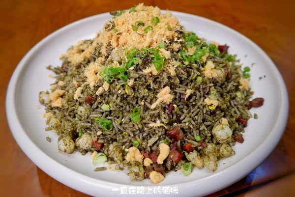 看起來就好吃的炒飯,米粒顆粒分明,海苔都掛在米粒上,臘肉碎、蝦仁和肉松混合在一起,忍不住吃瞭三碗。