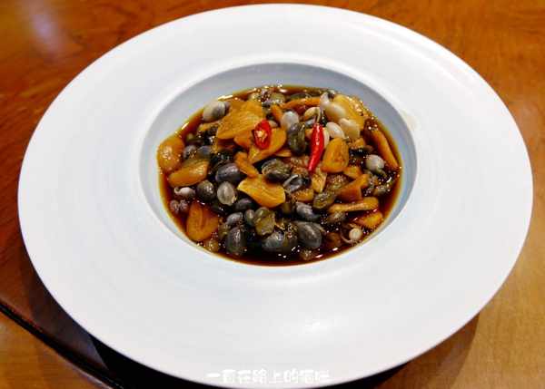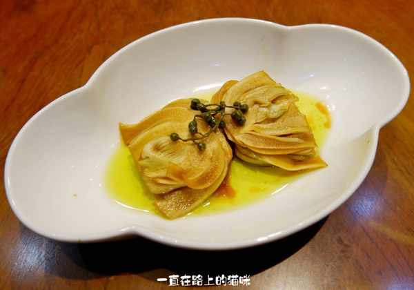 小象拔蚌切成片,口感脆嫩有嚼勁,下面鋪墊的是繡球菌,上面撒瞭韭菜粒,三者一起吃口感很融合更豐富。