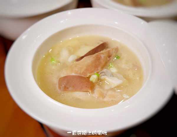 一人一份的即位菜,下面有在加熱不怕涼掉,鱘龍魚筋滿滿的膠原蛋白,豬肚燉的好,剛好軟爛又帶一點嚼頭的口感,加瞭胡椒,湯喝起來很舒服。