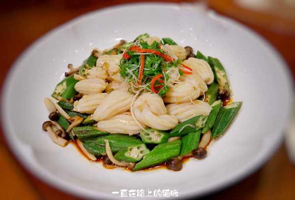 白嫩肥厚的花枝卷吃起來很有肉感很過癮,山椒的加入多瞭一份辣感,秋葵選的都是很嫩的,清新爽口。