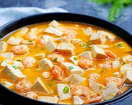 蛋黃搗爛,裝碗裡備用。鍋裡熱油,少油。先把蛋黃碎倒進煎炒一下,炒成油油的感覺,沒錯,想要的效果就要來瞭,富可流油!然後加入一開水,並熬制半分鐘。接著,我們把豆腐下瞭,小心攪動,不要都弄散瞭,大概是煮20秒的時間,緊接著就是下蝦二瞭,味道突然來個層次的跳躍,鮮!慢慢看著蝦從粉色煮成瞭橘紅色,饑餓的雙眼早已經紅瞭!
