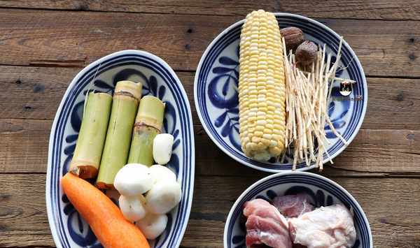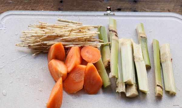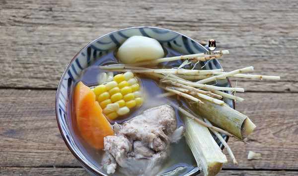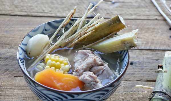 【材料】豬骨300克,茅根2兩,竹蔗3段,馬蹄(荸薺)幾個,甜玉米一根,蜜棗兩顆,紅蘿卜一根。