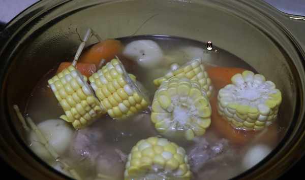 湯汁煲瞭40分鐘後水份蒸發瞭一些,把準備好的甜玉米切塊放入,轉中火煮10分鐘,最後加少許鹽調味。這一鍋湯就煲好瞭。
