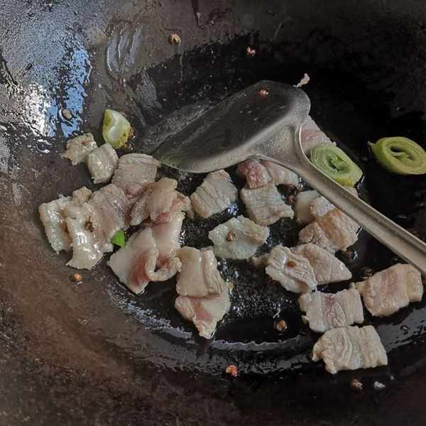 第二步:鍋裏燒幹,加入適量的花生油,加入葱薑爆香,倒入五花肉片煸炒出油脂。