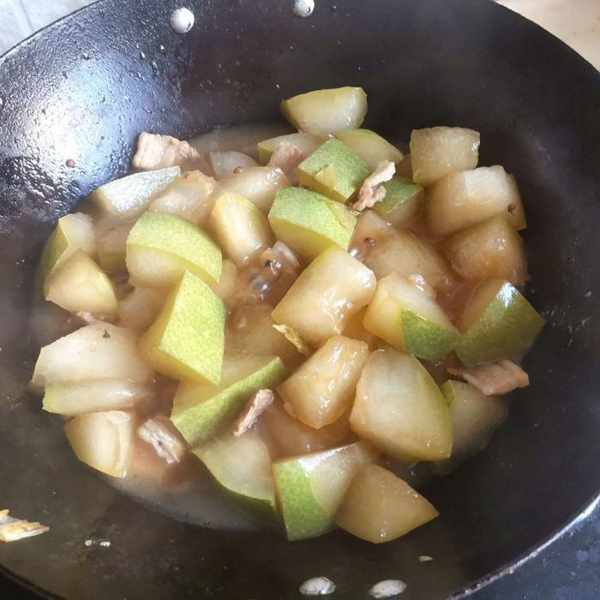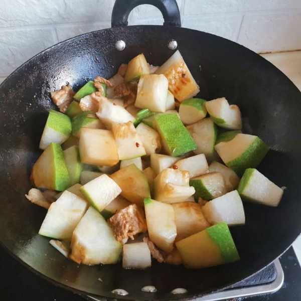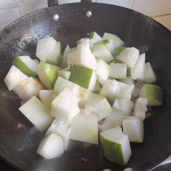 第四步:倒入冬瓜繼續煸炒,冬瓜帶皮其實去燥熱的效果就會更好,如果是老冬瓜,那麼就要去皮了,因為冬瓜很老皮也會很硬。