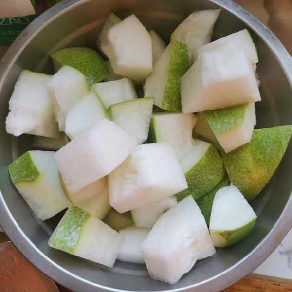 第一步:冬瓜,我們買稍微嫩一些的冬瓜,這樣可以不用去皮。冬瓜含有較多的蛋白質、糖類及少量的鈣、磷、鐵等礦物質和維他命C、瓜氨酸、鈣等營養素。冬瓜是瓜菜中唯一不含脂肪的瓜菜。而冬瓜中的維C是蕃茄的3倍,蘋果的6倍,平時多吃點不但可以清熱去燥還可以排毒養顏,是很不錯的一種瓜類蔬菜。