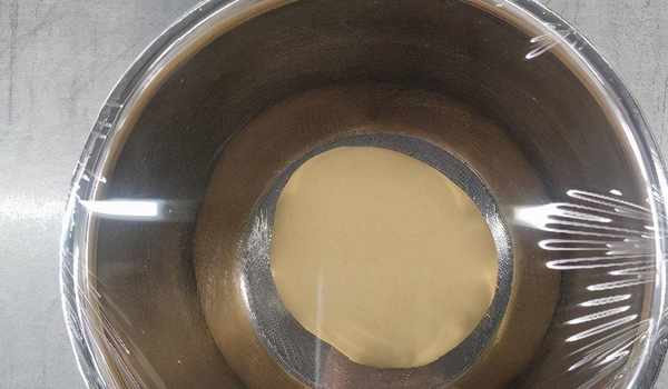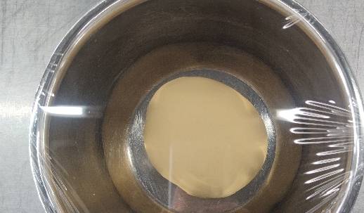 4.基礎發酵:面團放在容器中蓋上保險膜,在25℃左右環境溫度中發酵1~2h(從酵母液與面粉混合開始計時)。面團發酵成熟的標志為面團體積增加2倍左右,在面團表面輕輕按下不會立即彈起。