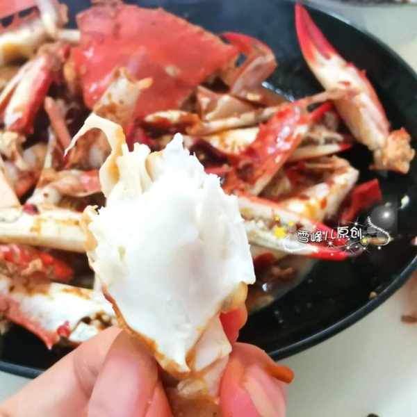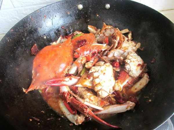 第六步:熟透後就可以出鍋了,這道菜其實可以不用放鹽,因為梭子蟹是海蟹,含有鹽分,郫縣豆瓣醬裏也有一定的鹽,再放鹽就會鹹了。