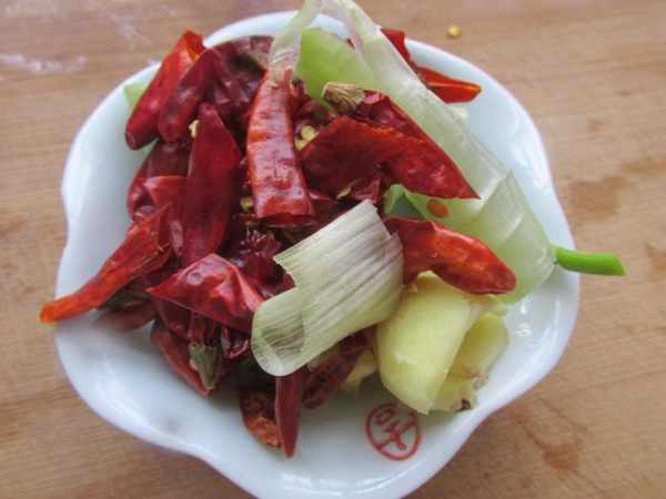 第三步:葱切段,薑切片,幹紅辣椒,花椒備用。