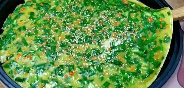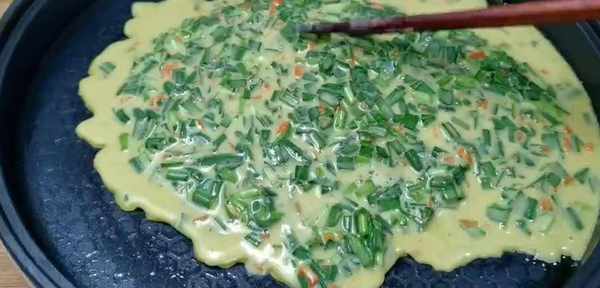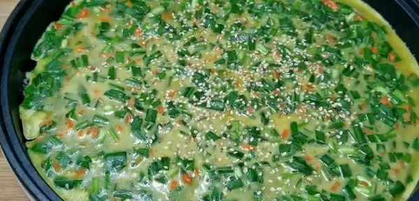 平底鍋倒入食用油,用刷子塗抹均勻,把菜糊倒進鍋中,用筷子把韭菜攤開,平鋪均勻,煎至1分鐘,晃動一下鍋,一面煎至金黃,撒上白芝麻增香。