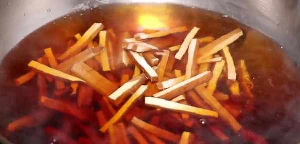 鍋中加入清水,大火燒開,加上一點食鹽,放上一點醬油,攪拌一下,把豆幹倒進來,煮兩分鐘,控水撈出來,瀝幹水分。