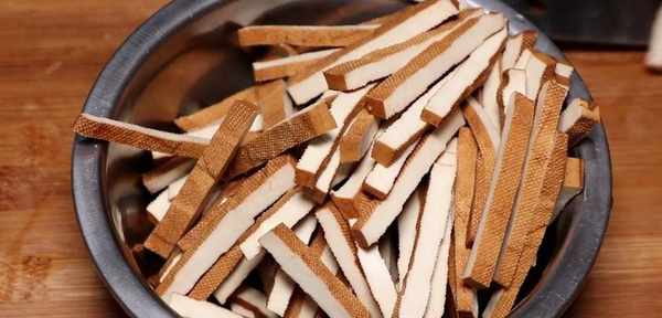準備一點香幹,放在案板上,切成細條,放到碗中備用。