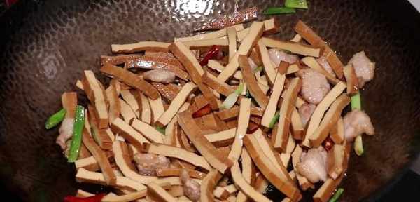 起鍋燒油,先放入肉片,大火翻炒變色,炒出油脂,再放入蔥蒜幹辣椒,繼續翻炒一下,炒出香味,再放入豆幹,繼續大火翻炒均勻,調味加入食鹽、蠔油、生抽、老抽上色。