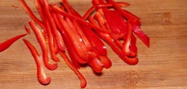大火翻炒均勻,把調料化開,再放入紅椒絲,翻炒兩下,把紅椒炒至斷生,再下入韭菜炒軟。