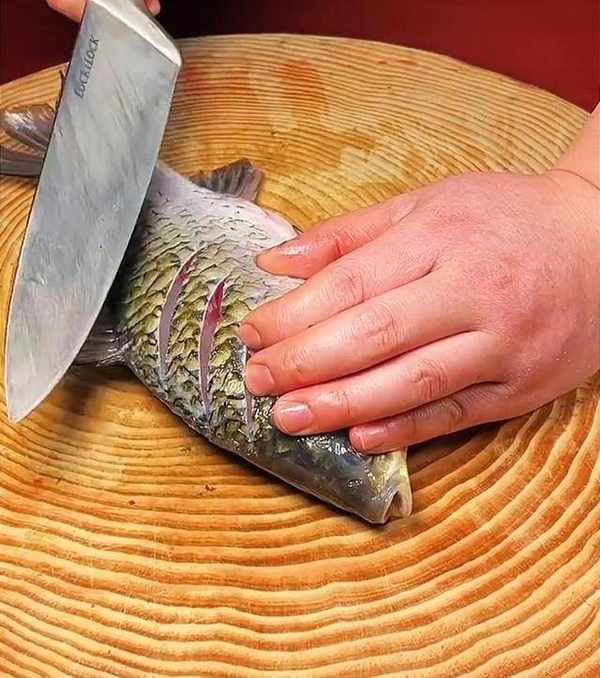 再用刀把鯽魚的正反面打上花刀,刀口不要打的太深,不然煎的時候容易煎爛。