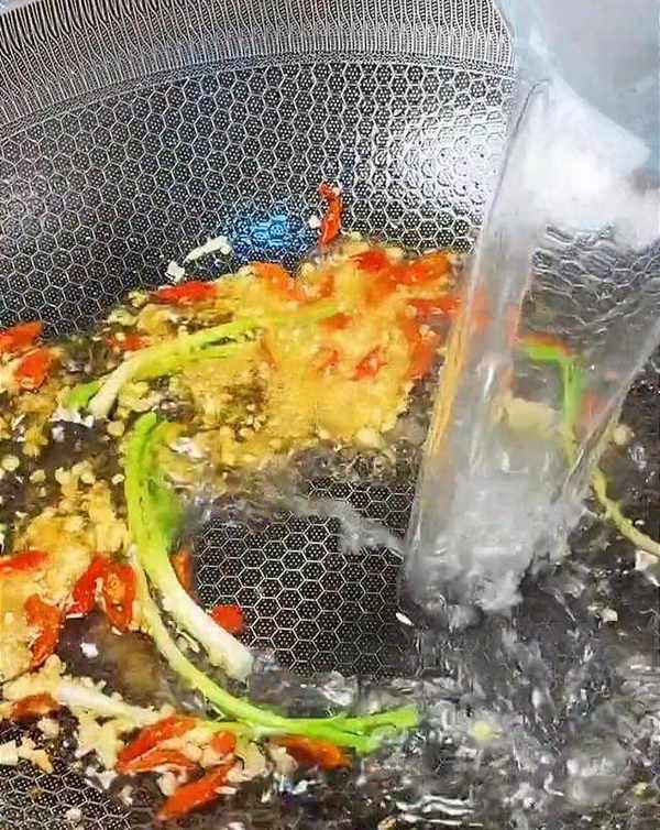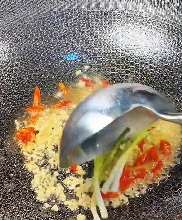 然後,用煎魚的油把蔥、薑、蒜、幹辣椒炒香。