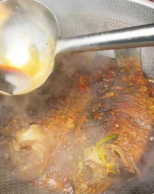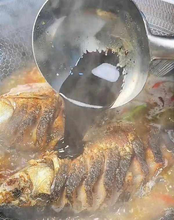 再加一大碗熱水,下入煎好的鯽魚,放鹽、胡椒粉、生抽提鮮,老抽上色,將湯汁攪拌均勻。