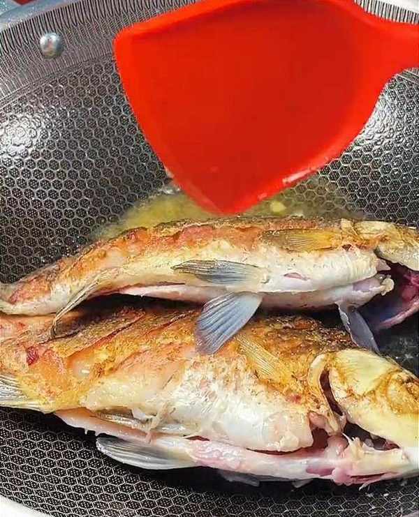 然後,快速的下入處理好的鯽魚,剛下入鍋中的魚,不要著急去動它,從頭到尾煎制定型,定型之後,再將鯽魚翻面,煎至兩面金黃,將魚盛出備用。